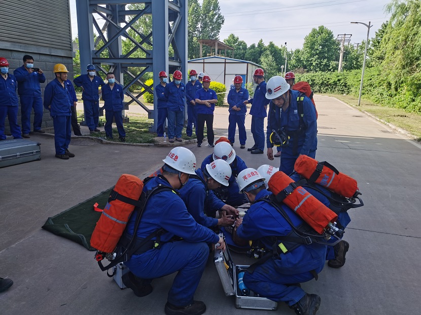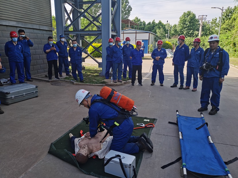 本次演練在公司安全總監(jiān)侯國棟的一聲令下,演練拉開序幕,由公司應(yīng)急救援隊組成的現(xiàn)場作業(yè)組、應(yīng)急救援組、疏導(dǎo)警戒組、醫(yī)療救護組等4組演練人員開展救援工作,相繼展示了事故發(fā)生后的事故報告、現(xiàn)場秩序維護、氣體檢測、救援三腳架搭設(shè)、安全防護裝備佩戴、通風設(shè)備使用、人員救護等應(yīng)急處置全過程。